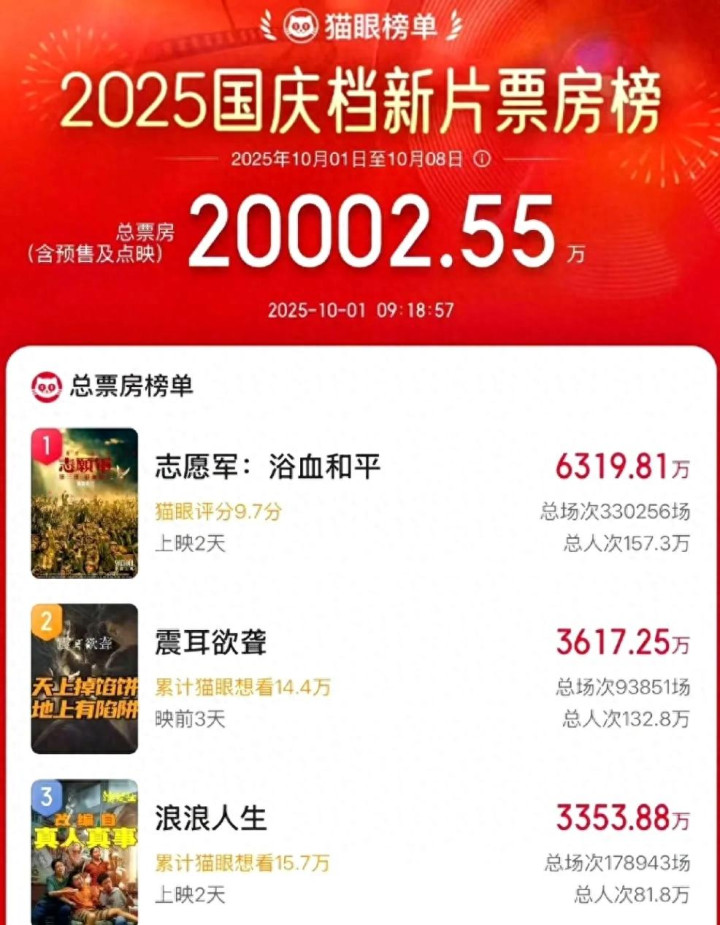 国庆档刚开局就炸了!新片总票房飕飕破2亿,电影院里简直是“笑泪双战场”——前一秒还在为《志愿军:浴血和平》里的谈判桌交锋攥紧拳头,下一秒可能就被《浪浪人生》的闽南式幽默逗出眼泪,转头又被《震耳欲聋》戳中揪心处。
